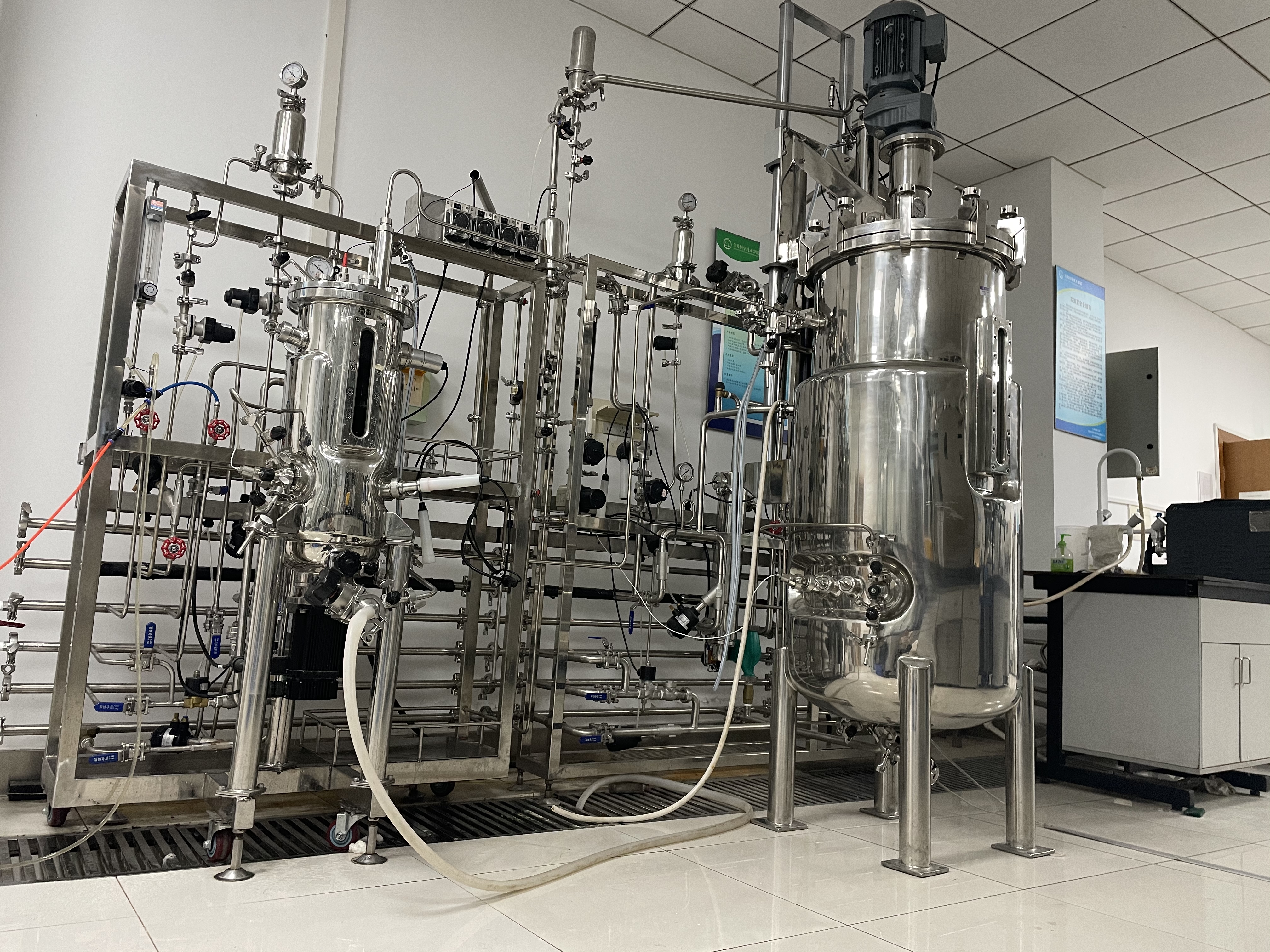 这是种子罐(左)和300L发酵罐(右),细胞工厂在这里进入中试环节,完成后才能进入工厂的规模化生产。(受访者供图)