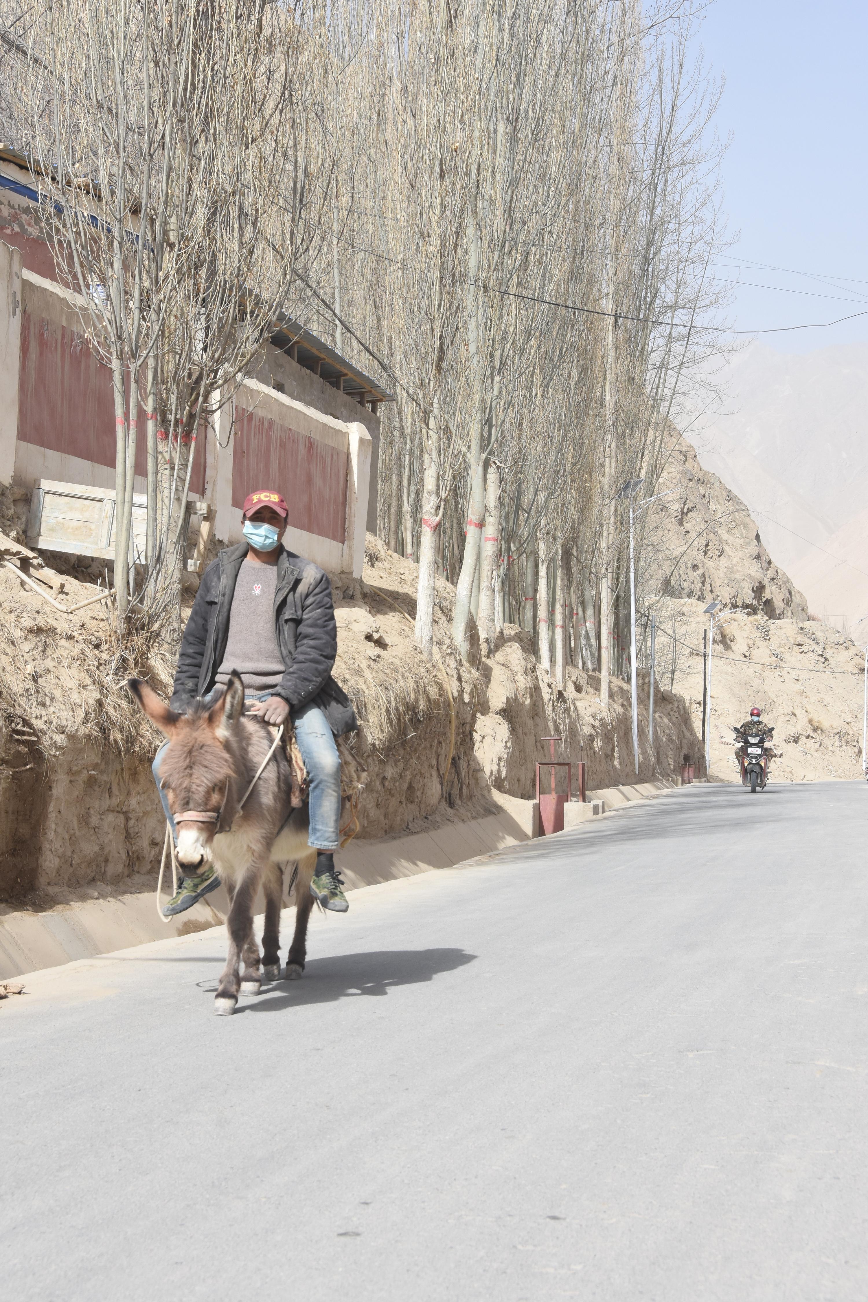这是喀让古塔格村街道上骑毛驴、骑摩托的村民。 新华社记者 张晓龙 摄