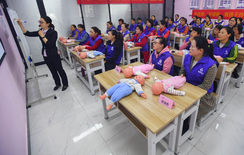 4月9日,在湖南省长沙市长沙县一家职业培训学校,老师在育婴员培训班上为学员们开展免费职业技能培训。 新华社记者 陈泽国 摄