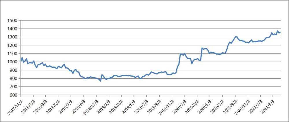 4月9日,指数报1354.68点,较上期(2021.3.29-4.4下同)上涨6.96点,涨幅0.52%,与基期相比上涨354.68点,涨幅35.47%。