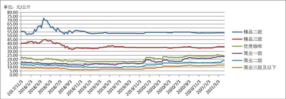 具体来看,精品二级咖啡豆均价报53.50元/公斤,较上期下跌0.07元/公斤,跌幅0.13%;精品三级咖啡豆均价报35.95元/公斤,较上期上涨0.02元/公斤,涨幅0.06%;优质咖啡豆均价报24.46元/公斤,较上期上涨0.12元/公斤,涨幅0.49%;商业一级咖啡豆均价报23.27元/公斤,较上期上涨0.07元/公斤,涨幅0.30%;商业二级咖啡豆均价报18.07元/公斤,较上期上涨0.32元/公斤,涨幅1.80%;商业三级及以下咖啡豆均价报12.42元/公斤,较上期持平。