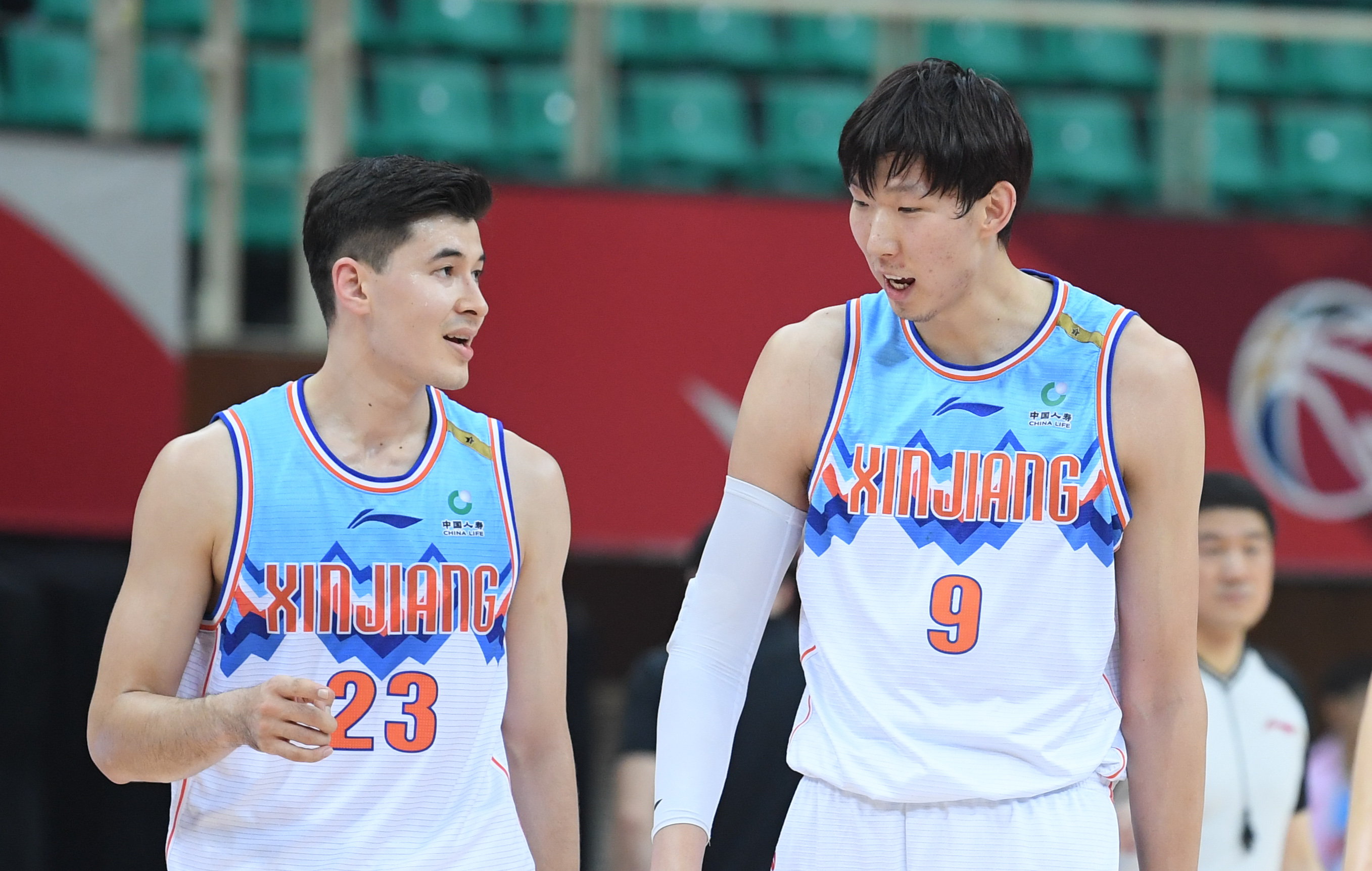 新疆队球员阿不都沙拉木(左)与队友周琦交流。新华社记者翁忻旸摄