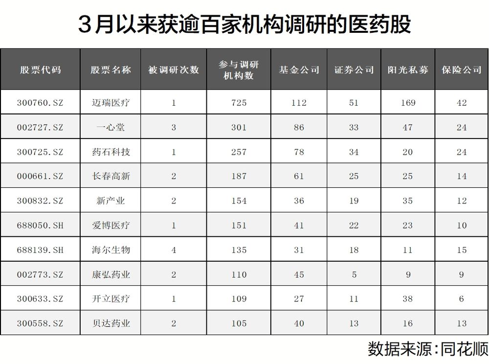 值得关注的是,近期险资对医药股关注度有所提升。数据显示,3月以来,已有39家A股上市药企获保险机构调研,迈瑞医疗、一心堂、药石科技、海尔生物、长春高新、贝达药业、新产业、爱博医疗、云南白药等九家公司受到10家以上保险机构关注。而今年前两个月,仅26家上市药企被险资调研。