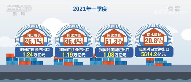 今年一季度,我国外贸进出口总值8.47万亿元人民币,同比增长29.2%。其中出口4.61万亿元,同比增长38.7%;进口3.86万亿元,同比增长19.3%。