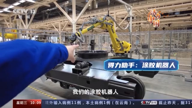 我们现在看到的是另外一个得力助手,我们的涂胶机器人。以前我们是两个人作业,需要3分钟的时间,现在,我们只要一台机器人,1分钟即可完成整个涂胶过程,而且还规避了我们过去涂胶不均匀这样一个质量风险。