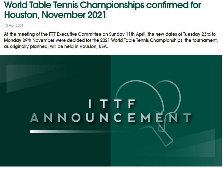 “继2020年韩国釜山世界乒乓球团体锦标赛被取消之后,为2021年世乒赛寻找解决方案变得至关重要。”他说,休斯敦世乒赛也将是这一赛事首次在美国举办。