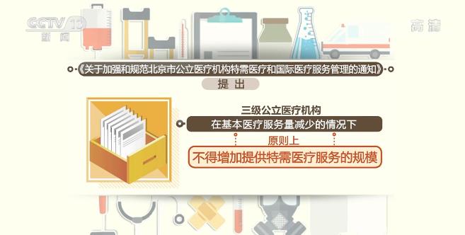 《关于加强和规范北京市公立医疗机构特需医疗和国际医疗服务管理的通知》中提出,北京市将根据区域卫生规划和各级各类医疗机构功能定位,严格控制公立医疗机构用于特需医疗服务的床位数,其不得超过医疗机构登记床位总数的10%。除特需夜门诊和特需节假日门诊外,副主任医师及以上职称的在职医师特需门诊出诊单元数量不超过医疗机构出诊单元总量的10%。一级和二级公立医疗机构以为辖区居民提供基本医疗服务为主要功能,原则上不得开展特需医疗服务。三级公立医疗机构在基本医疗服务量减少的情况下,原则上不得增加提供特需医疗服务的规模。