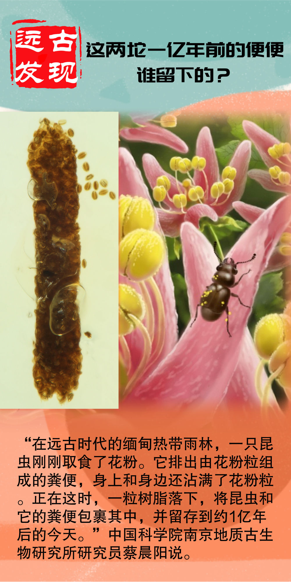 “在远古时代的缅甸热带雨林,一只昆虫刚刚取食了花粉。它排出由花粉粒组成的粪便,身上和身边还沾满了花粉粒。正在这时,一粒树脂落下,将昆虫和它的粪便包裹其中,并留存到约1亿年后的今天。”蔡晨阳说。
