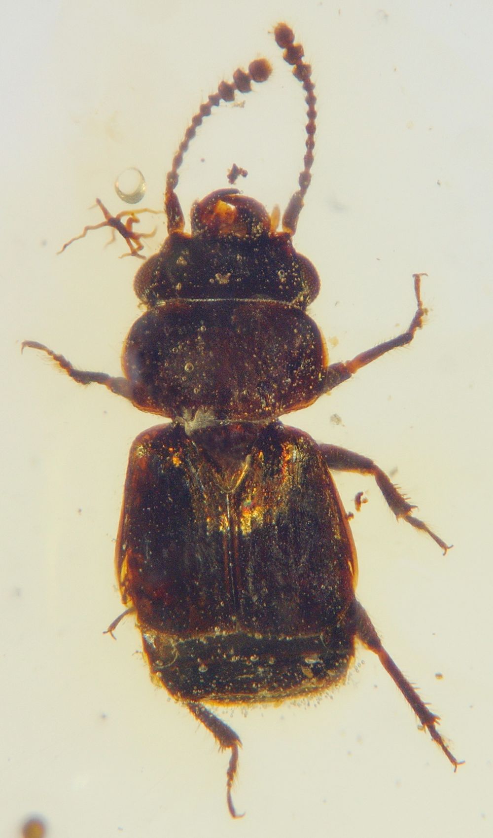 领导此项研究的中科院南古所研究员蔡晨阳介绍,在琥珀化石中发现昆虫和它的粪便非常罕见。此次,科研团队共研究了超过2.5万枚琥珀,才在其中发现一个这样的案例。从形态上看,新发现的两枚昆虫粪便整体呈长柱状,由上千枚极为微小的椭球型花粉粒组成。距离粪便不到2毫米处,即为新发现的短翅花甲昆虫化石。这种昆虫的腹部和腿,长有便于附着花粉的毛。其虫体表面和四周,也散落着不少花粉颗粒。