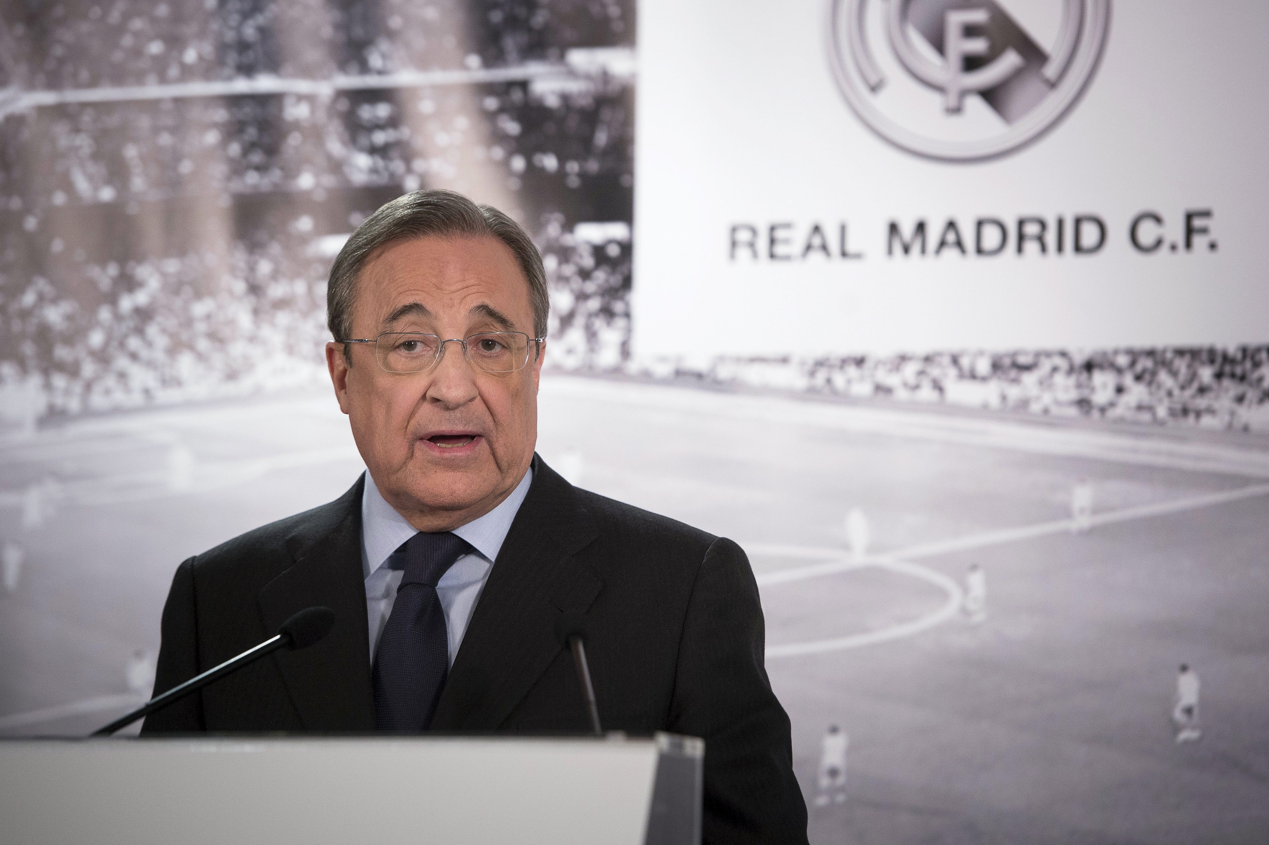 资料图:皇家马德里主席弗洛伦蒂诺在马德里出席新闻发布会。