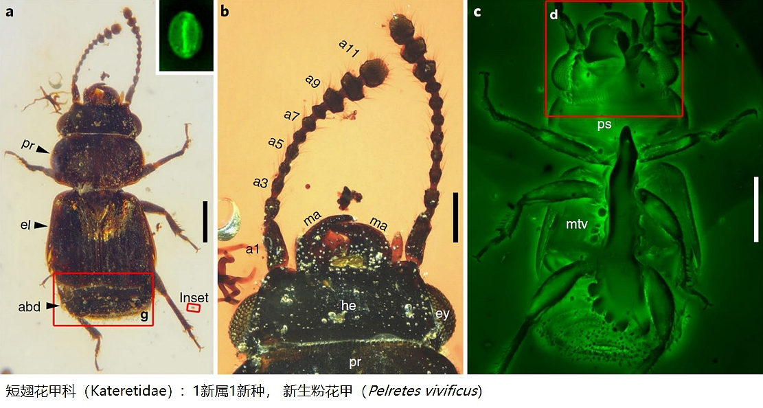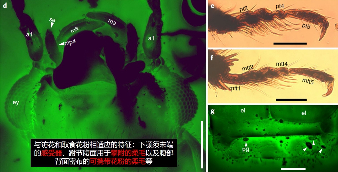 甲虫被超过100枚花粉颗粒包围,附近有四个聚集而成的花粉簇。令人惊奇的是,这枚甲虫的腹部、腿部等部位和身体附近有许多高等开花植物的花粉和花粉簇,以及两枚由大量花粉组成的甲虫粪便,这也是在琥珀内首次发现甲虫粪便化石。
