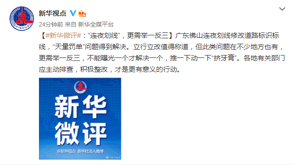 广东佛山连夜划线修改道路标识标线,“天量罚单”问题得到解决。立行立改值得称道,但此类问题在不少地方也有,更需举一反三,不能曝光一个才解决一个,推一下动一下“挤牙膏”。各地有关部门应主动排查,积极整改,才是更有意义的行动。