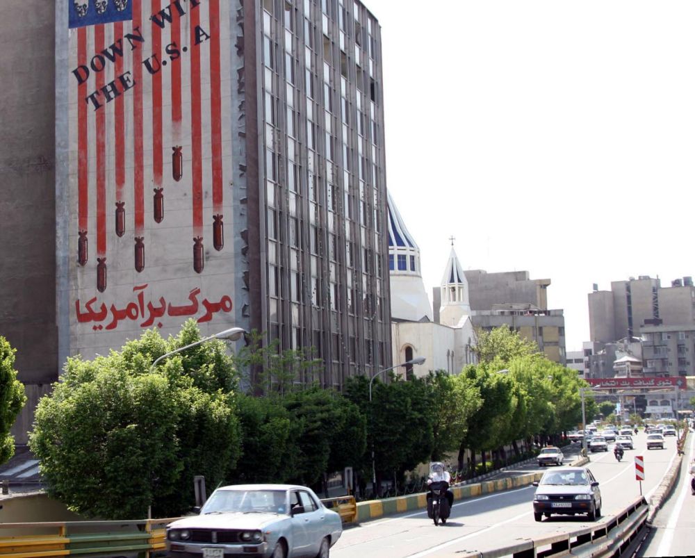 2006年4月13日,在伊朗首都德黑兰街头,车辆从绘有反美宣传画的大楼旁驶过。(新华社记者安治平摄)