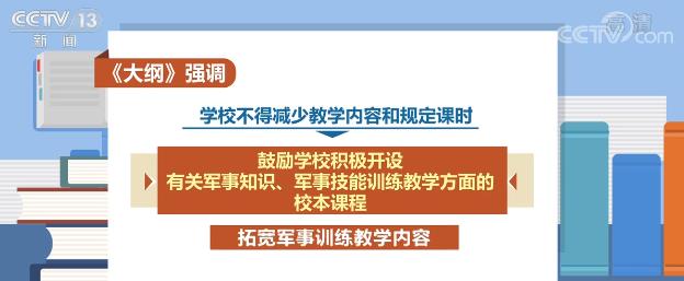 高中阶段学校学生军事训练教学内容含必训内容和选训内容。《大纲》强调,学校不得减少教学内容和规定课时。鼓励学校积极开设有关军事知识、军事技能训练教学方面的校本课程,拓宽军事训练教学内容。