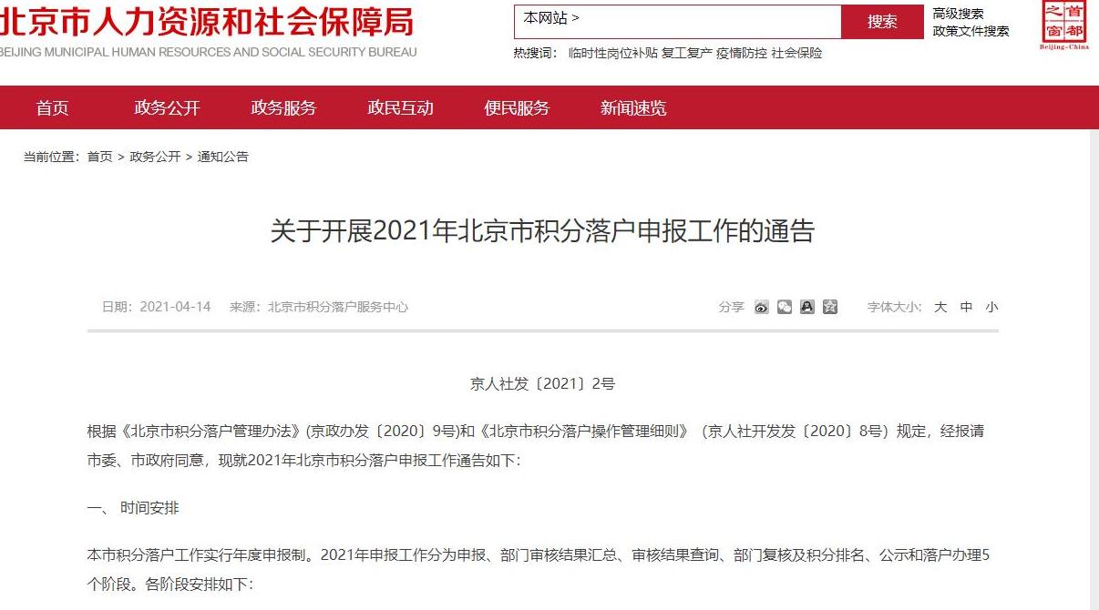 北京市人力资源和社会保障局14日发布消息,北京市2021年积分落户申报工作将于4月15日正式启动,申报期限为30日,7月12日起将在市政府门户网站“首都之窗”公示年度落户人员信息。