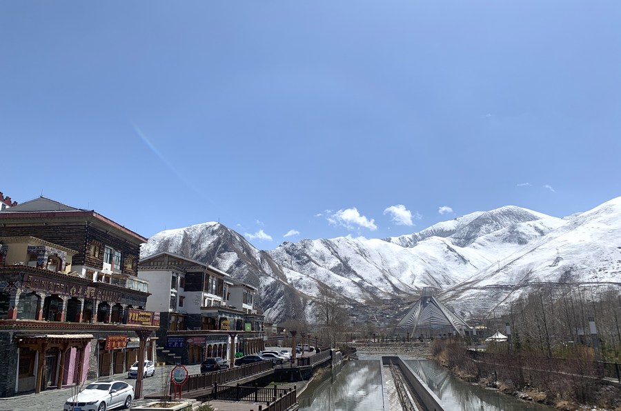 这是位于玉树市扎曲河畔林立的商铺。(2021年4月14日摄)新华社记者 李琳海 摄