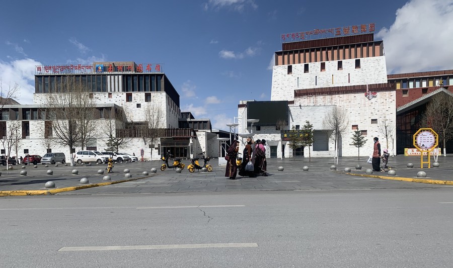 图为位于玉树市中心的玉树州图书馆和玉树歌舞团。(2021年4月14日摄)新华社记者 李琳海 摄