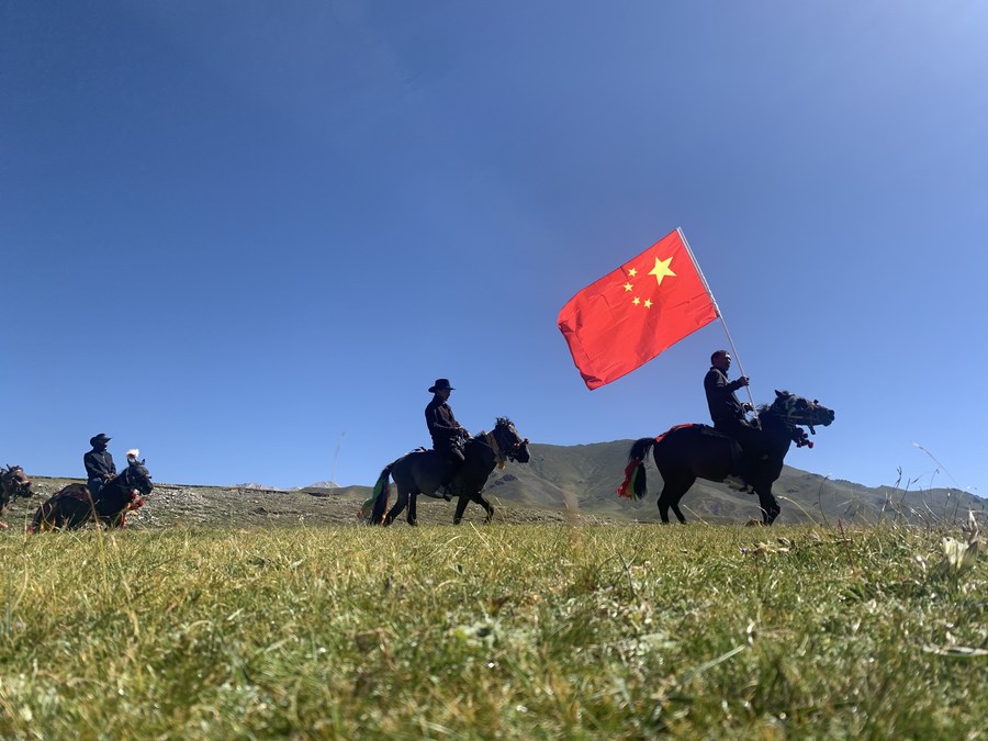 这是青海省玉树藏族自治州治多县的生态管护员骑马进行巡护。(2020年8月26日摄)新华社记者 李琳海 摄