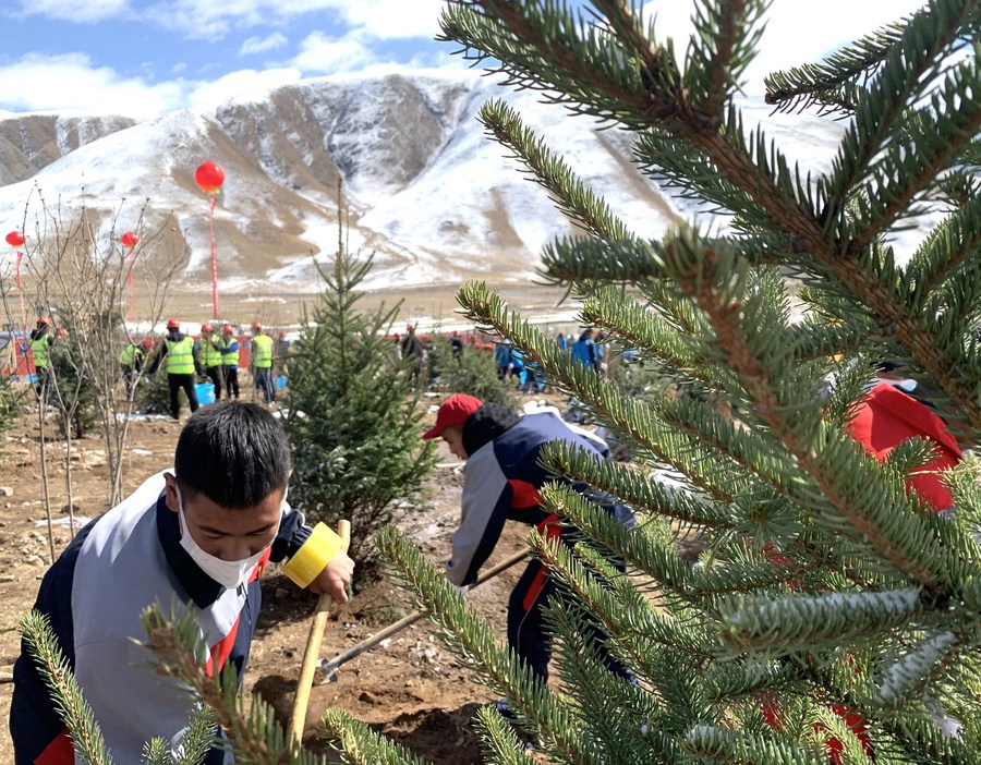 4月14日当天,玉树举行植树活动。图为当地学生在距离玉树市区约7公里的山坡植树。新华社记者 李琳海 摄