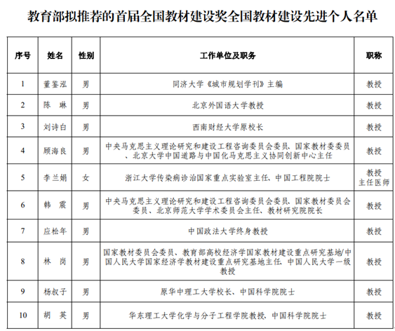 教育部拟推荐的首届全国教材建设奖全国教材建设先进个人名单(部分)。