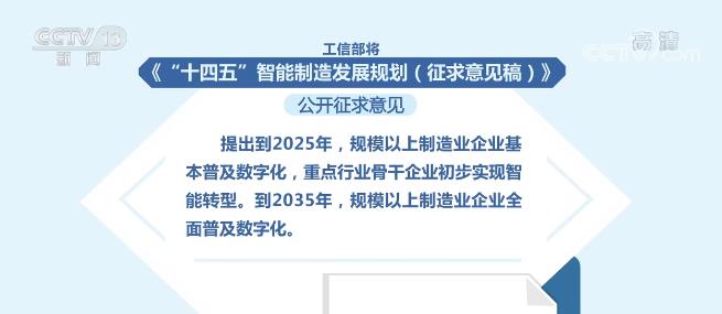 央视网消息:昨天(14日),工业和信息化部将《“十四五”智能制造发展规划(征求意见稿)》公开征求意见。提出到2025年,规模以上制造业企业基本普及数字化,重点行业骨干企业初步实现智能转型。到2035年,规模以上制造业企业全面普及数字化。