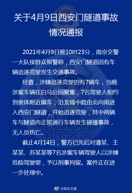 江苏南京交警4月14日晚发布调查通告:2021年4月9日晚10时23分,南京交警一大队接群众报警称,西安门隧道因有车辆追逐竞驶发生交通事故。