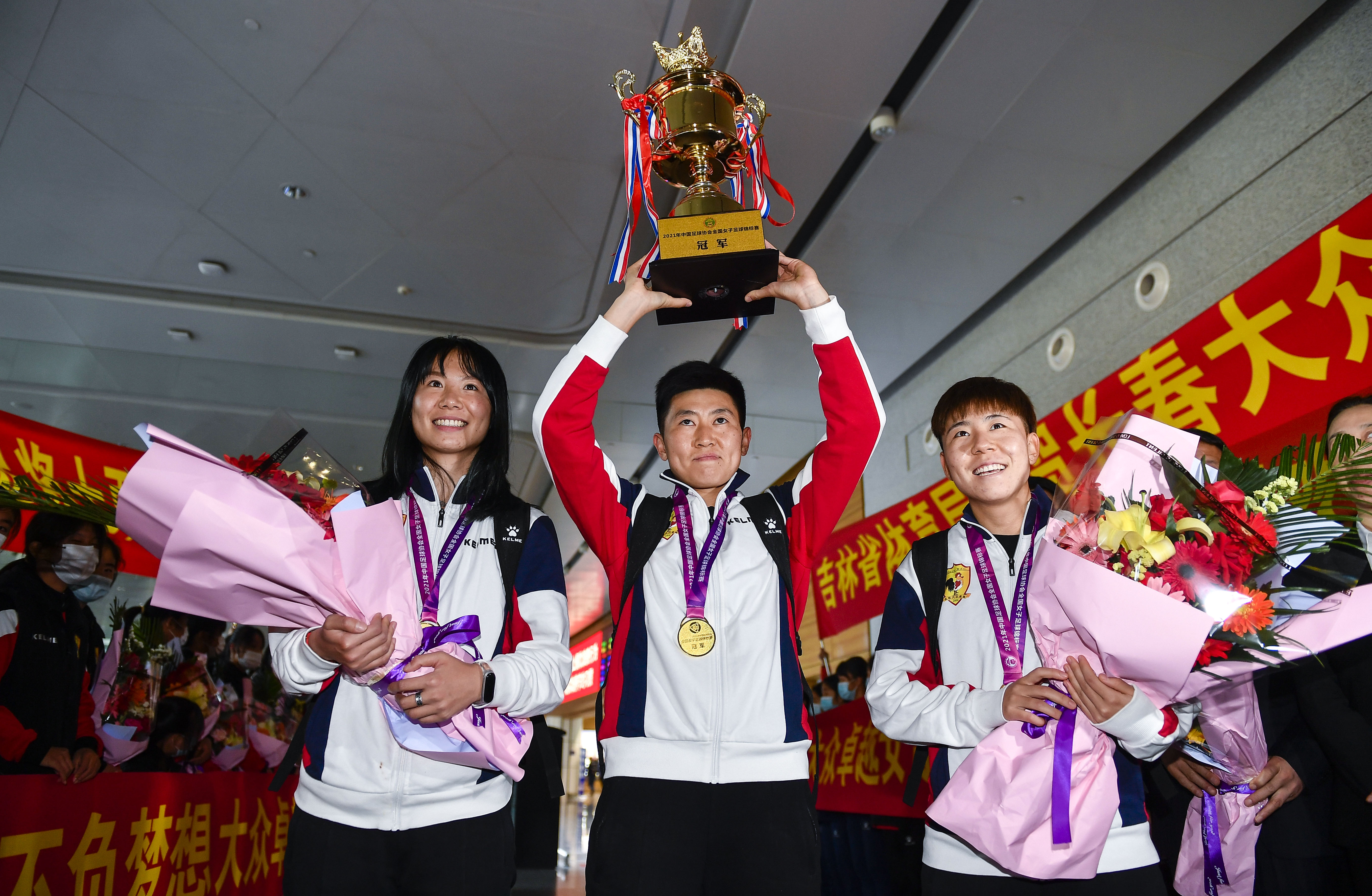 4月14日,长春女足队球员李雯(中)手捧冠军奖杯。新华社记者许畅摄
