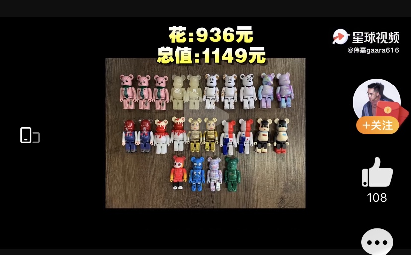 事实上,为了投资而进入“熊圈”的年轻人不在少数,社交网络上也充斥着大量关于“积木熊”的科普视频,许多视频明示或暗示“积木熊”是“赚钱好工具”。记者在一条开箱视频中就看到,主持人一边开箱,一边将“积木熊”的买入价与收益价进行对比打在屏幕上,提示最终收益价高于买入价,引得不少网友发弹幕表示看了视频想要入手。