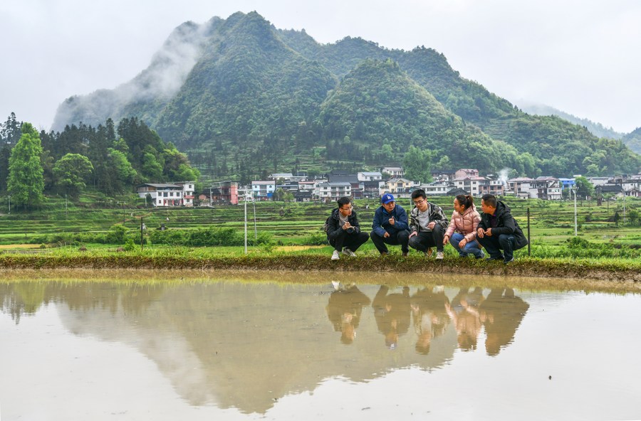 4月12日,黔东南苗族侗族自治州麻江县优质稻高产实验示范田里,微耕机正把水田平整,赵祥榕和带着研究生赶来的南京农业大学教授李刚华一起,商讨播种育苗。