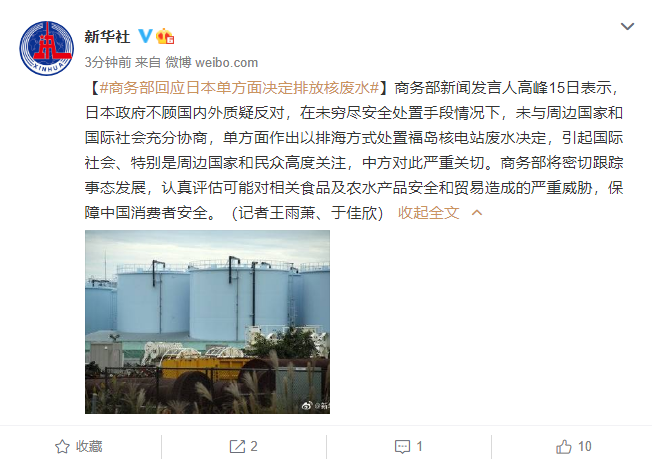 【商务部回应日本单方面决定排放核废水】商务部新闻发言人高峰15日表示,日本政府不顾国内外质疑反对,在未穷尽安全处置手段情况下,未与周边国家和国际社会充分协商,单方面作出以排海方式处置福岛核电站废水决定,引起国际社会、特别是周边国家和民众高度关注,中方对此严重关切。商务部将密切跟踪事态发展,认真评估可能对相关食品及农水产品安全和贸易造成的严重威胁,保障中国消费者安全。(记者王雨萧、于佳欣)