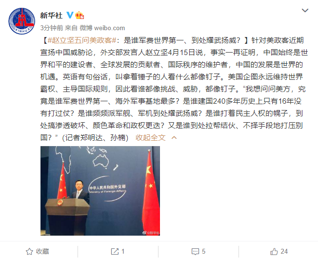 【赵立坚五问美政客:是谁军费世界第一、到处耀武扬威?】针对美政客近期宣扬中国威胁论,外交部发言人赵立坚4月15日说,事实一再证明,中国始终是世界和平的建设者、全球发展的贡献者、国际秩序的维护者,中国的发展是世界的机遇。英语有句俗话,叫拿着锤子的人看什么都像钉子。美国企图永远维持世界霸权、主导国际规则,因此看谁都像挑战、威胁,都像钉子。“我想问问美方,究竟是谁军费世界第一、海外军事基地最多?是谁建国240多年历史上只有16年没有打过仗?是谁频频派军舰、军机到处耀武扬威?是谁打着民主人权的幌子,到处搞渗透破坏、颜色革命和政权更迭?又是谁到处拉帮结伙、不择手段地打压别国?”(记者郑明达、孙楠)