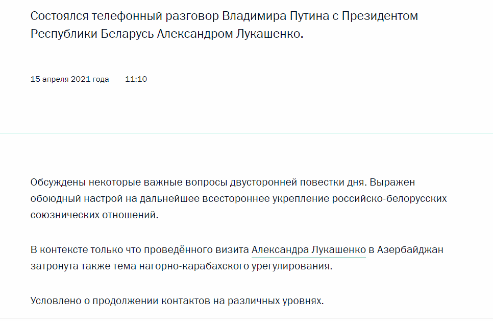 当地时间4月15日,俄罗斯总统网站发布消息称,俄罗斯总统普京与白俄罗斯总统卢卡申科通电话,就纳卡地区局势交换了意见,商定继续在各层级就此问题保持沟通。