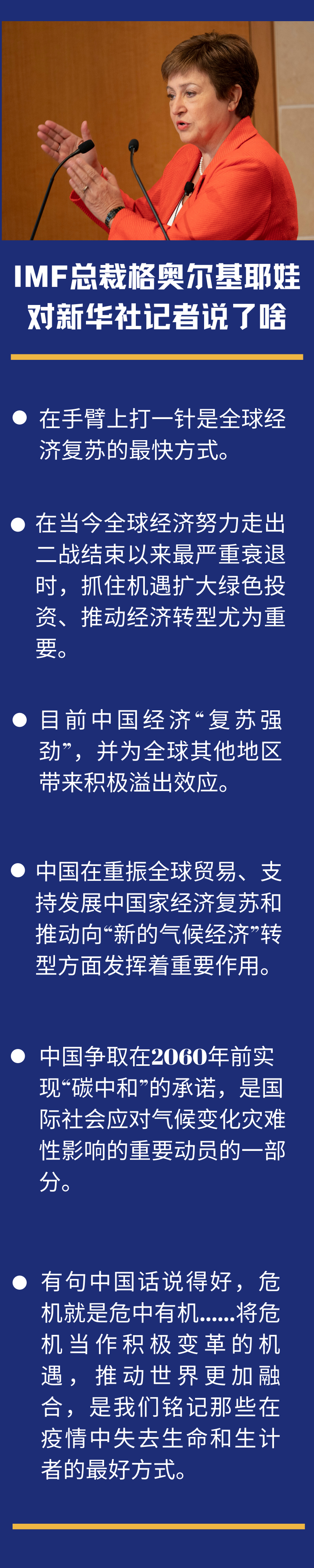 格奥尔基耶娃指出,新冠疫情再次表明全球经济是如此相互依赖,同时凸显多边合作的价值。她呼吁为经济复苏滞后的国家提供全面政策支持,避免全球经济出现“危险的分化”。她说,目前政策制定者的首要任务是在全球各地加快接种疫苗,“在手臂上打一针是全球经济复苏的最快方式”,并为所有国家带来巨大价值。IMF预计,更快普及疫苗、结束新冠危机能让全球国内生产总值到2025年增加近9万亿美元。