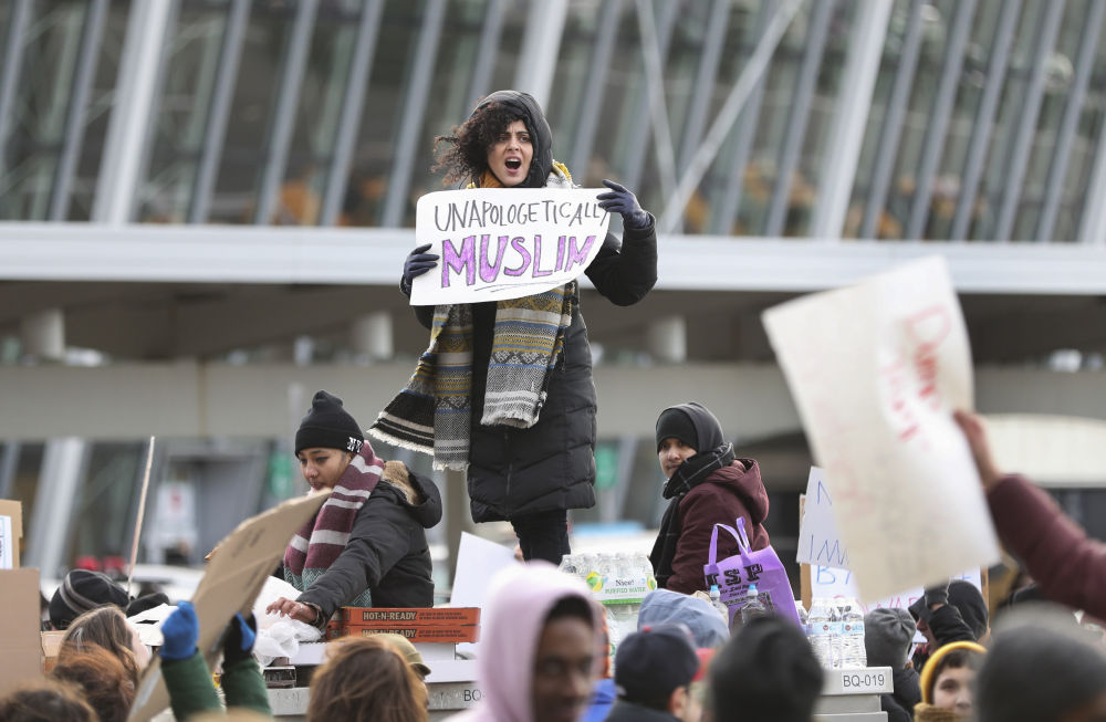2017年1月29日,人们在美国纽约肯尼迪机场航站楼外抗议。数百名抗议者当天在机场集会,抗议时任美国总统特朗普签署行政令禁止7个伊斯兰国家公民入境美国。(新华社记者王迎摄)