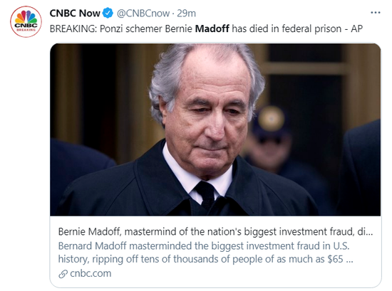 △美国媒体CNBC报道,麦道夫在狱中死亡。