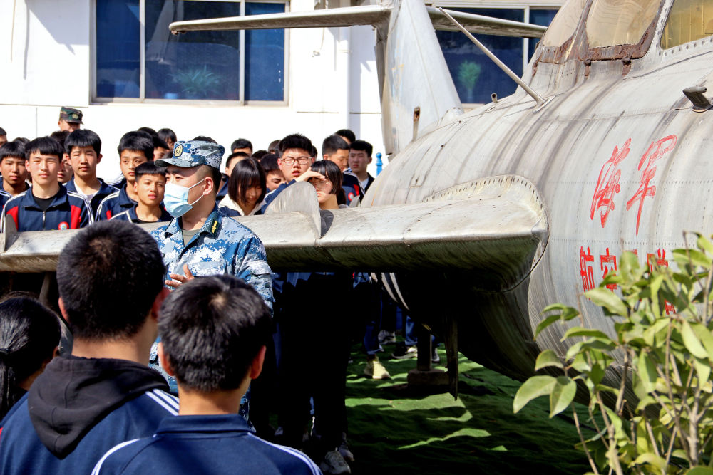 2021年4月14日,在河北省邢台市柏乡县国防教育基地,人武部工作人员在为县职教中心的学生讲授国防安全教育课。