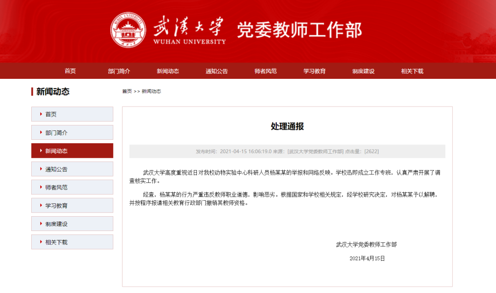 武汉大学高度重视近日对我校动物实验中心科研人员杨某某的举报和网络反映。经查,杨某某的行为严重违反教师职业道德,影响恶劣。根据国家和学校相关规定,经学校研究决定,对杨某某予以解聘,并按程序报请相关教育行政部门撤销其教师资格。详情>>>