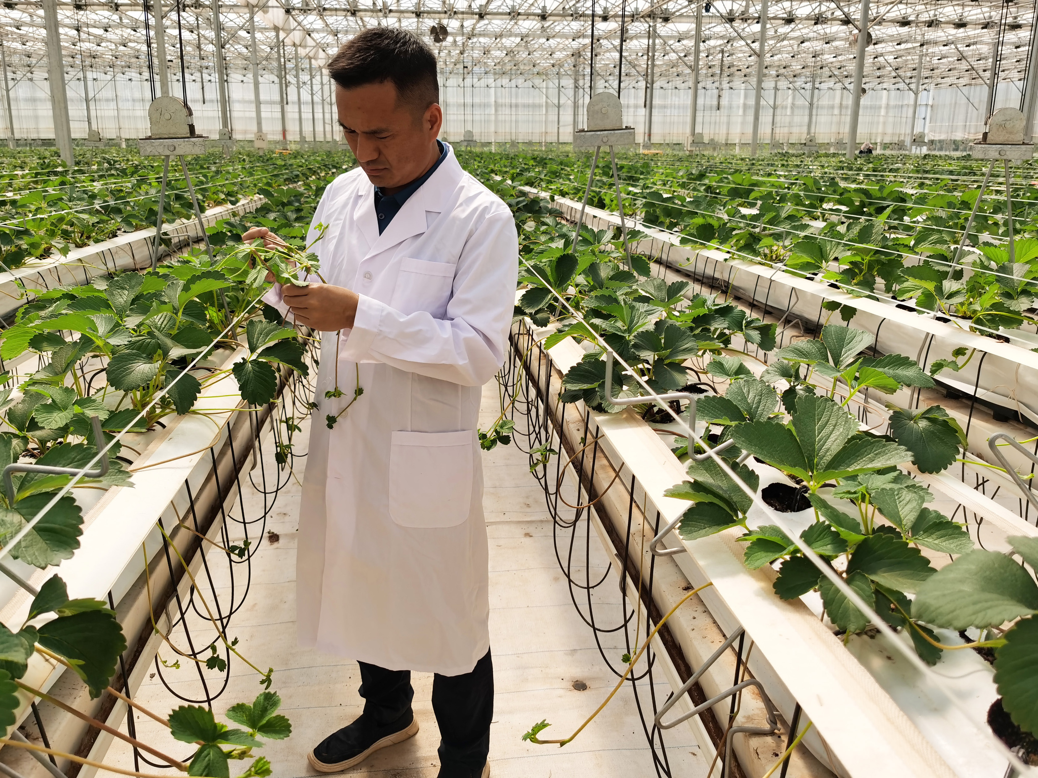 云南省农科院花卉研究所研究员阮继伟查看草莓种苗长势(4月14日摄)。新华社发
