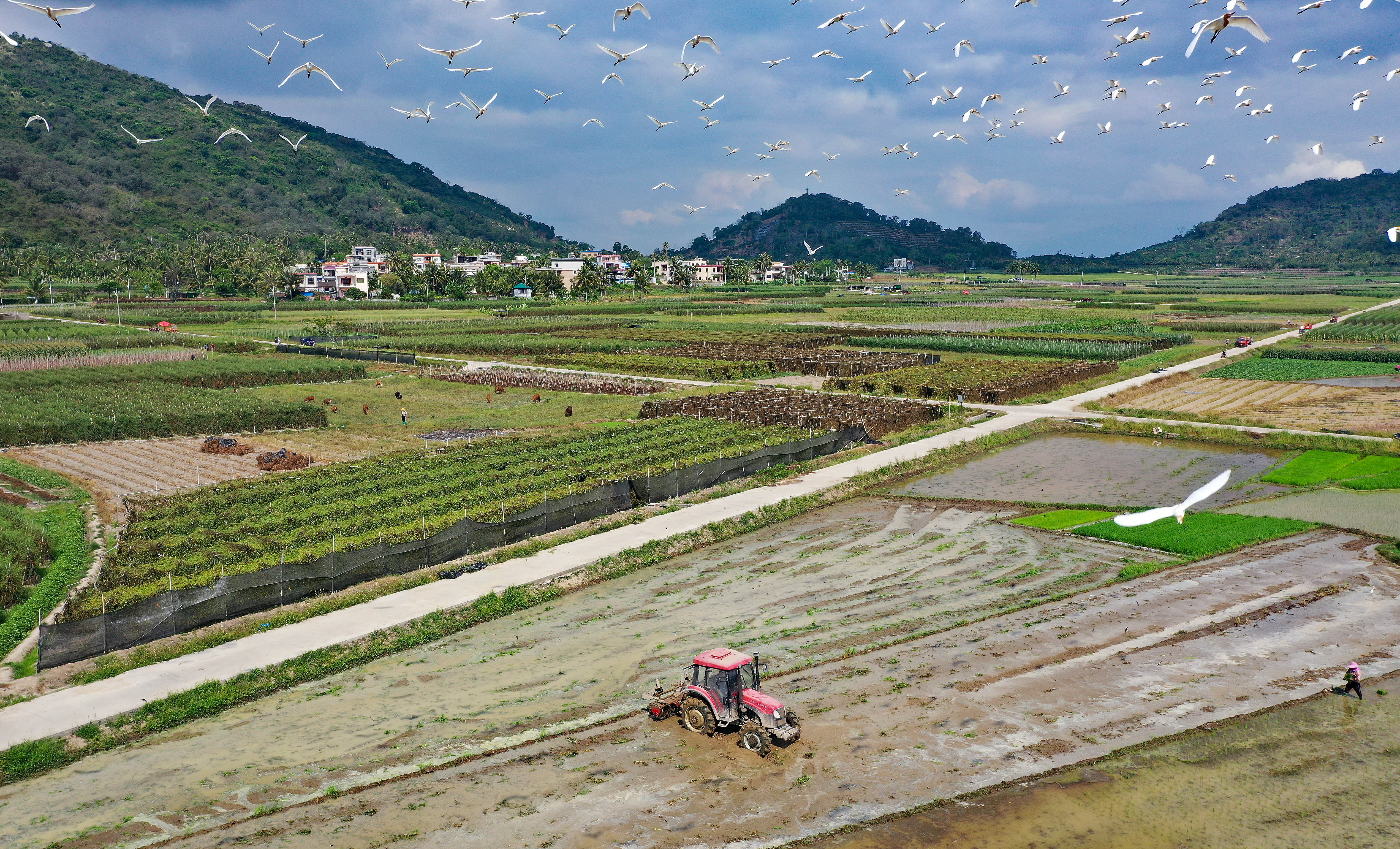 海南省陵水黎族自治县光坡镇的农民在田间劳作(4月5日摄,无人机照片)。新华社记者 郭程 摄