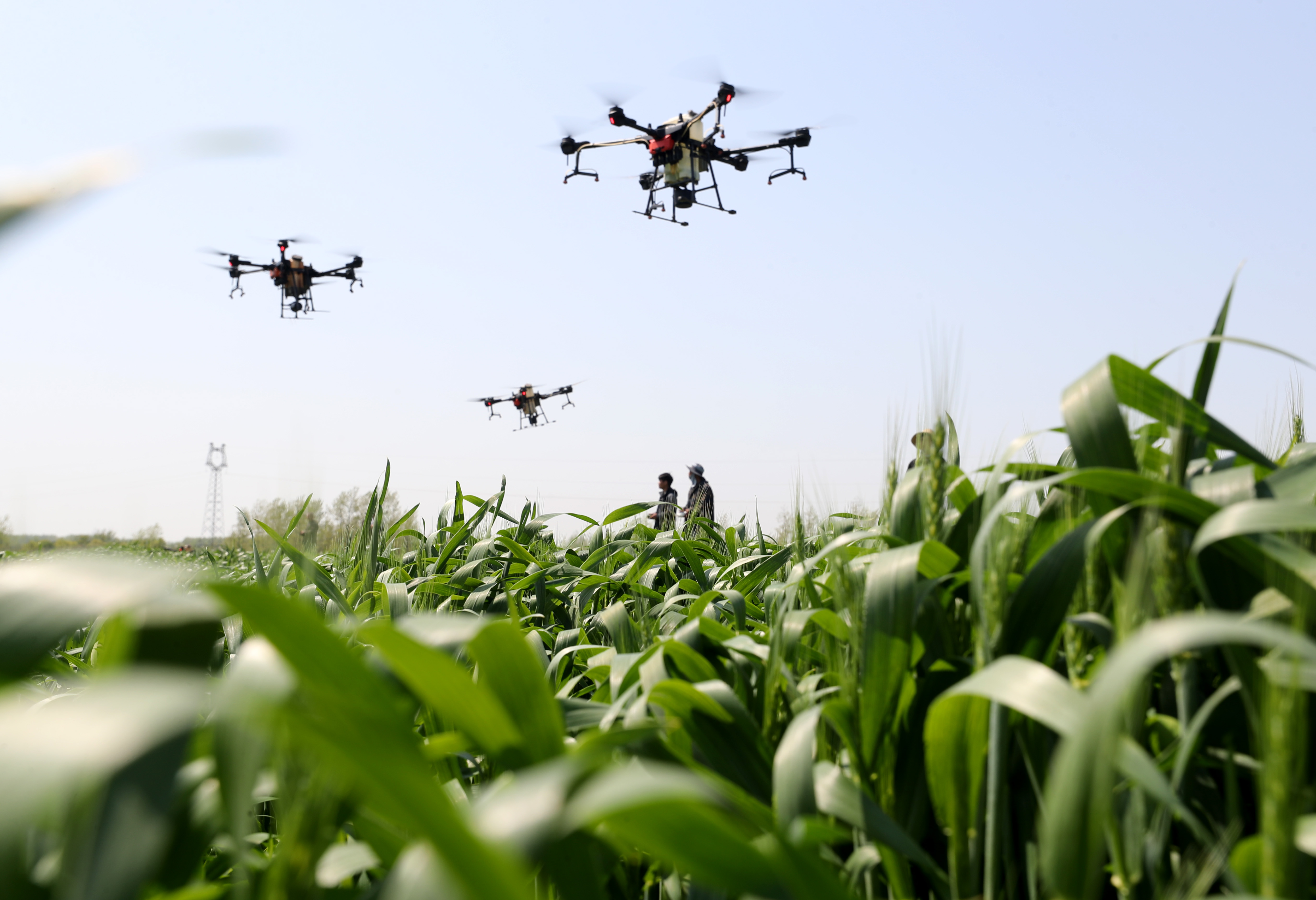 4月9日,在安徽省全椒县六镇镇草庵村,工作人员操作植保无人机开展喷防作业。新华社发 沈果 黄臻 编制