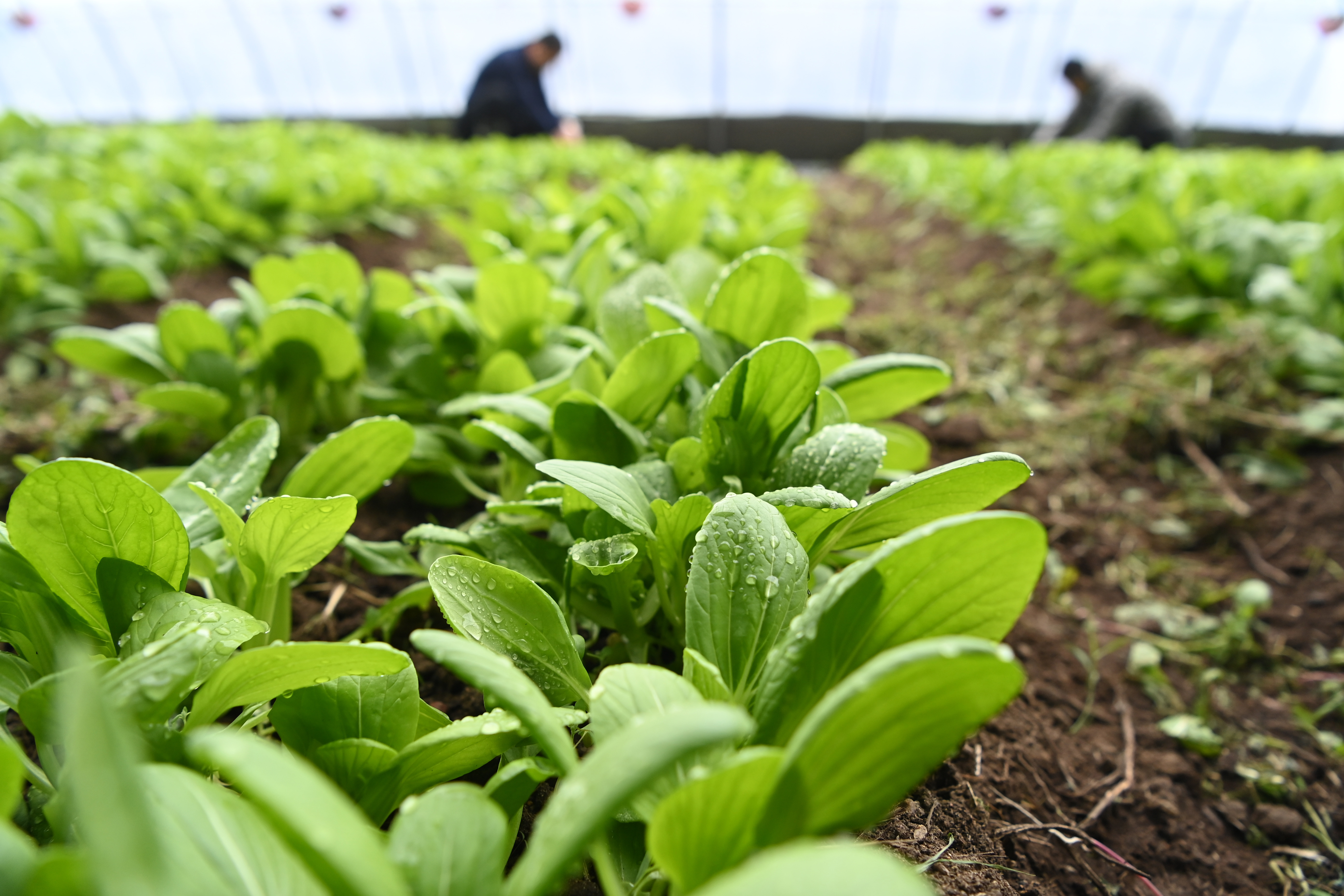 在黑龙江北大荒农垦集团双峰农场有限公司果蔬产业园区智控温室,工作人员在清除菜地里的杂草(3月5日摄)。新华社记者 王建威 摄