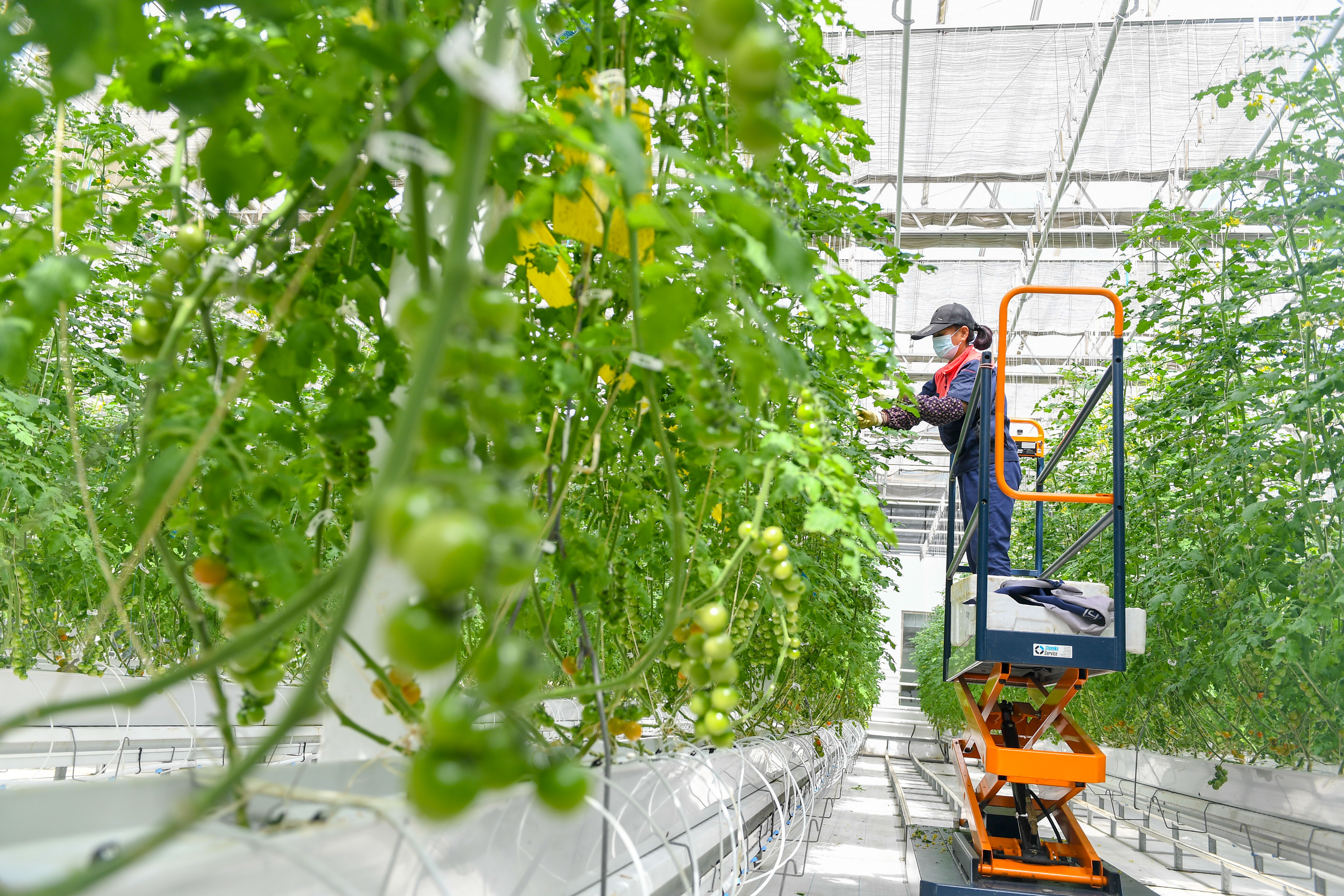 在吉林卓远农业种植专业合作社的“植物工厂”,农民赵玉霞在修整作物(4月14日摄)。新华社记者 张楠 摄
