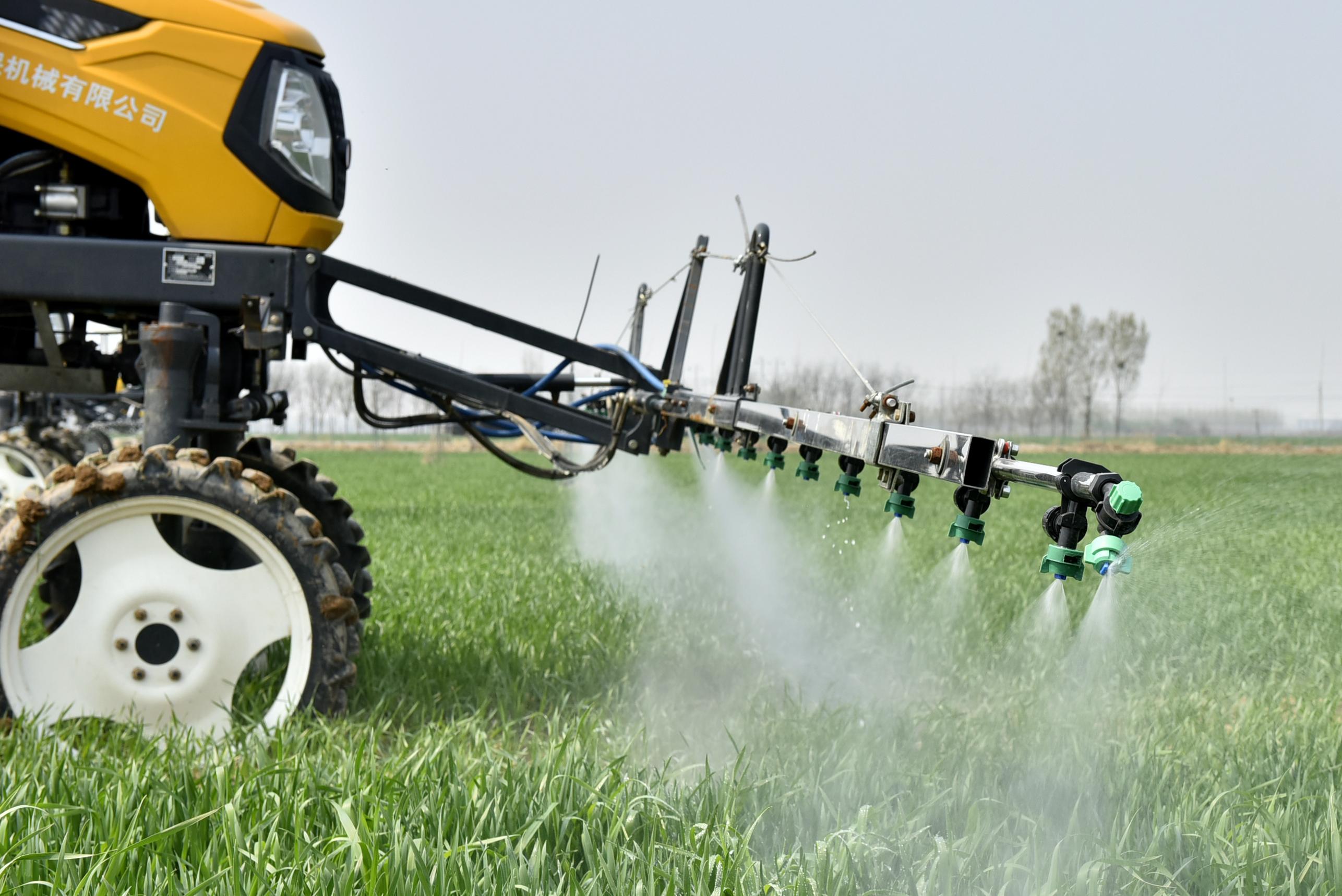 在河北沧州泊头市西辛店乡大付村,工作人员操作高低隙自走式喷杆喷雾机进行小麦苗期病虫害防治作业(4月6日摄)。新华社发(苑立伟 摄)