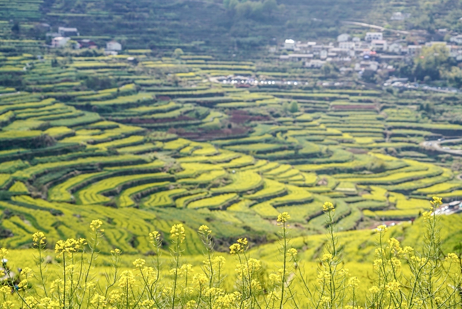 这是位于浙江省绍兴市上虞区岭南乡的覆卮山梯田的油菜花(3月28日摄)。新华社记者 杜涓涓 摄