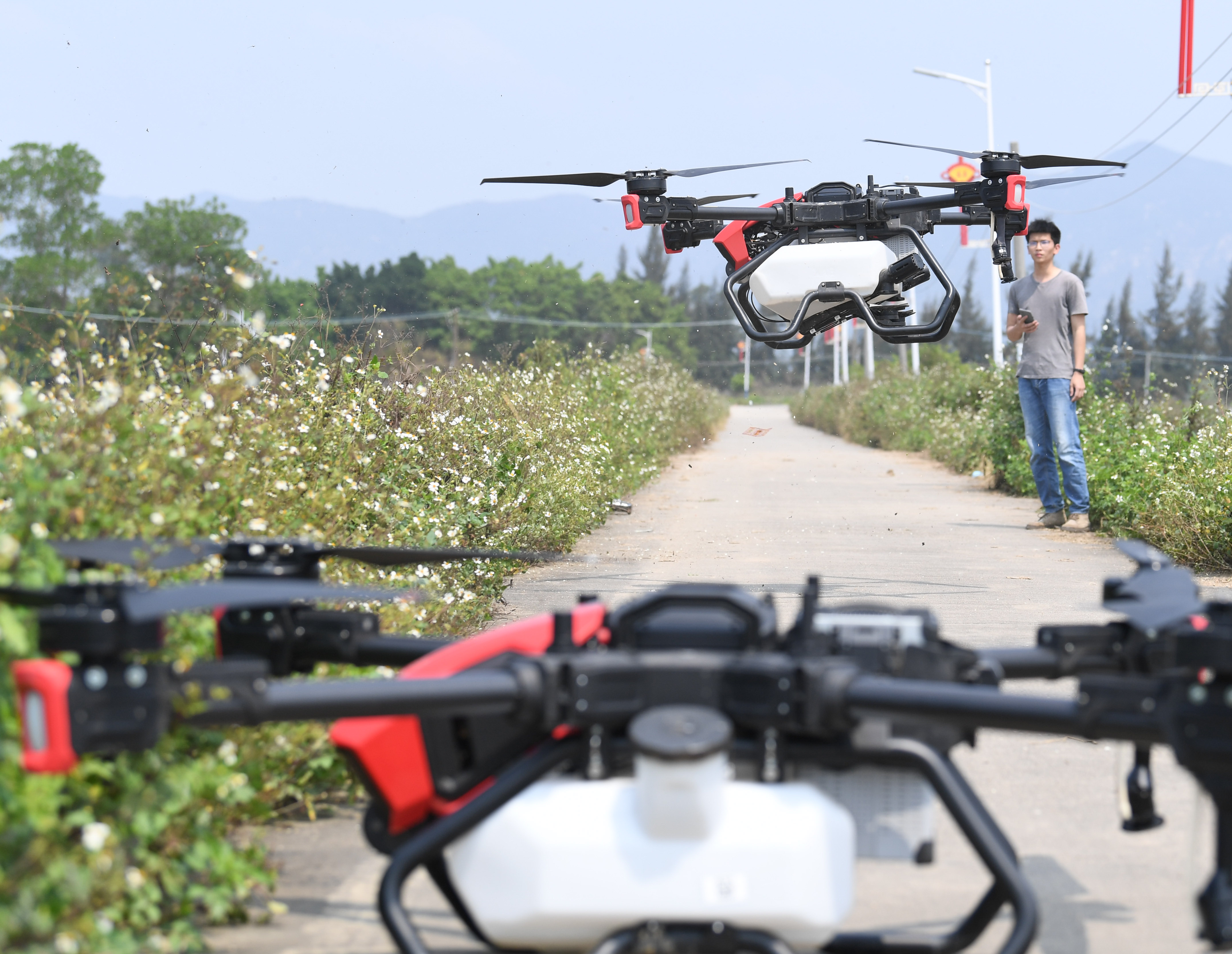 在广东台山汶村镇茭一村,工作人员启动农业无人机升空(3月12日摄)。新华社记者 邓华 摄