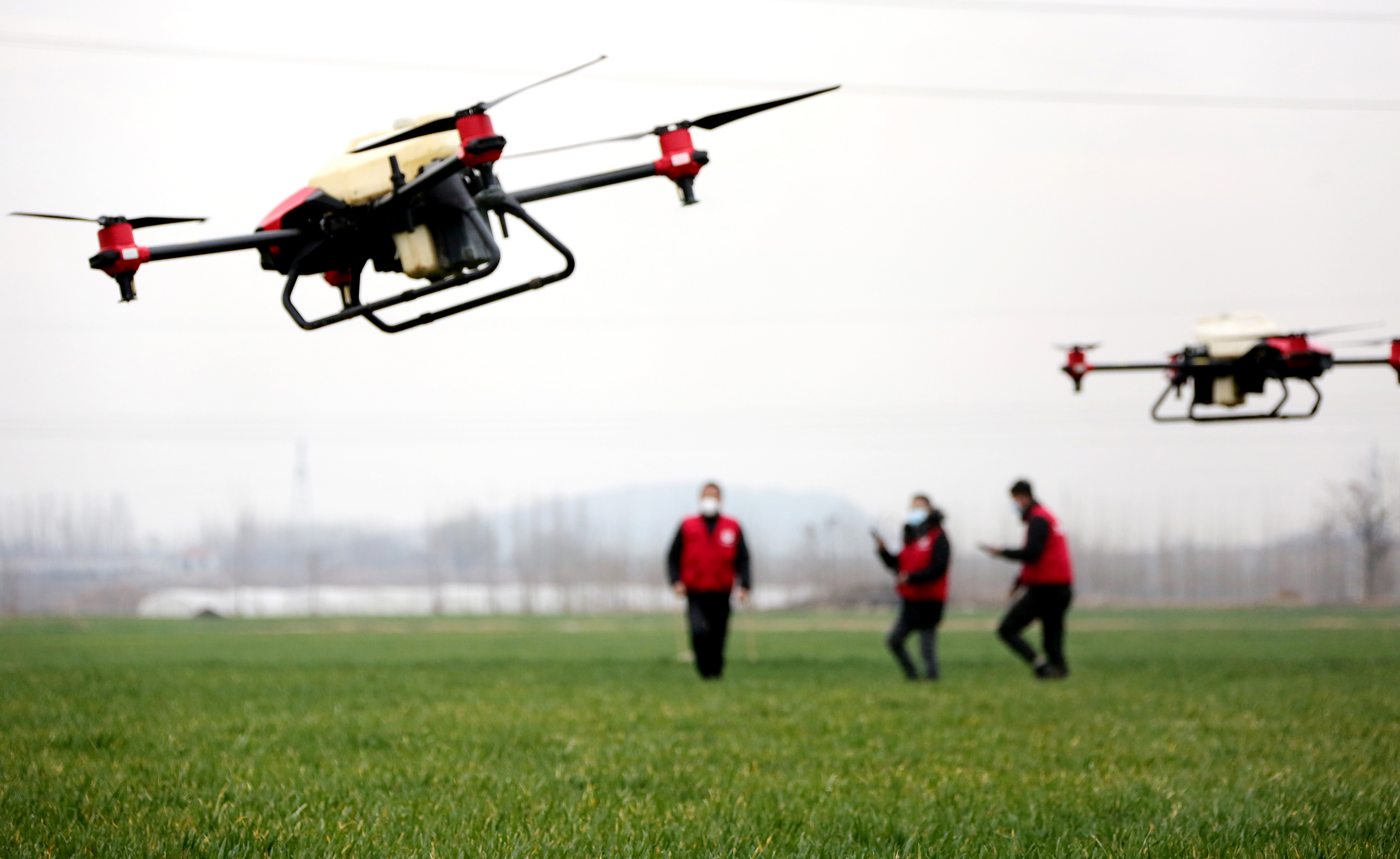 在山东省枣庄市市中区税郭镇野岗埠村,工作人员使用植保无人机在麦田里喷洒除草剂(2月27日摄)。新华社发(孙中喆 摄)