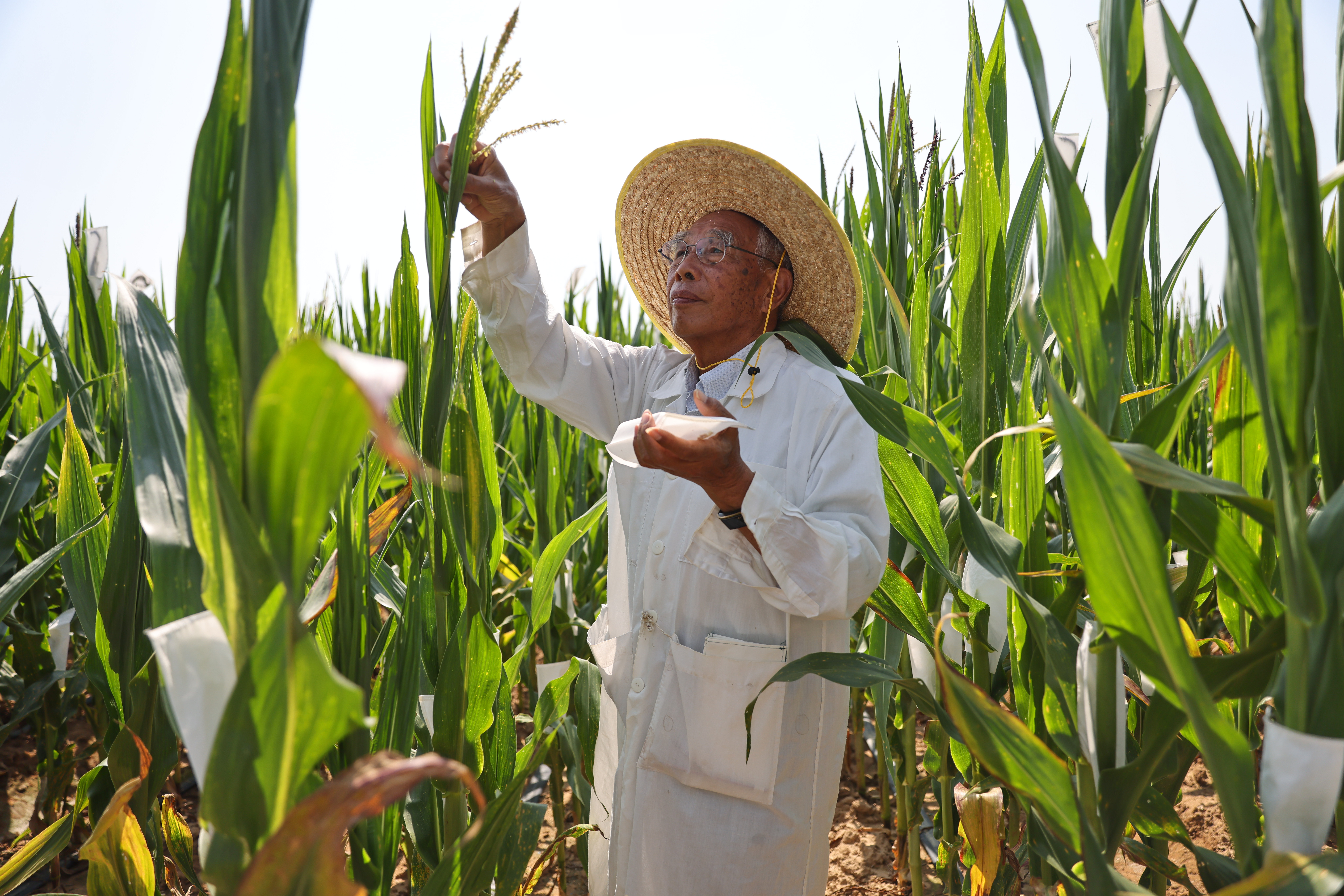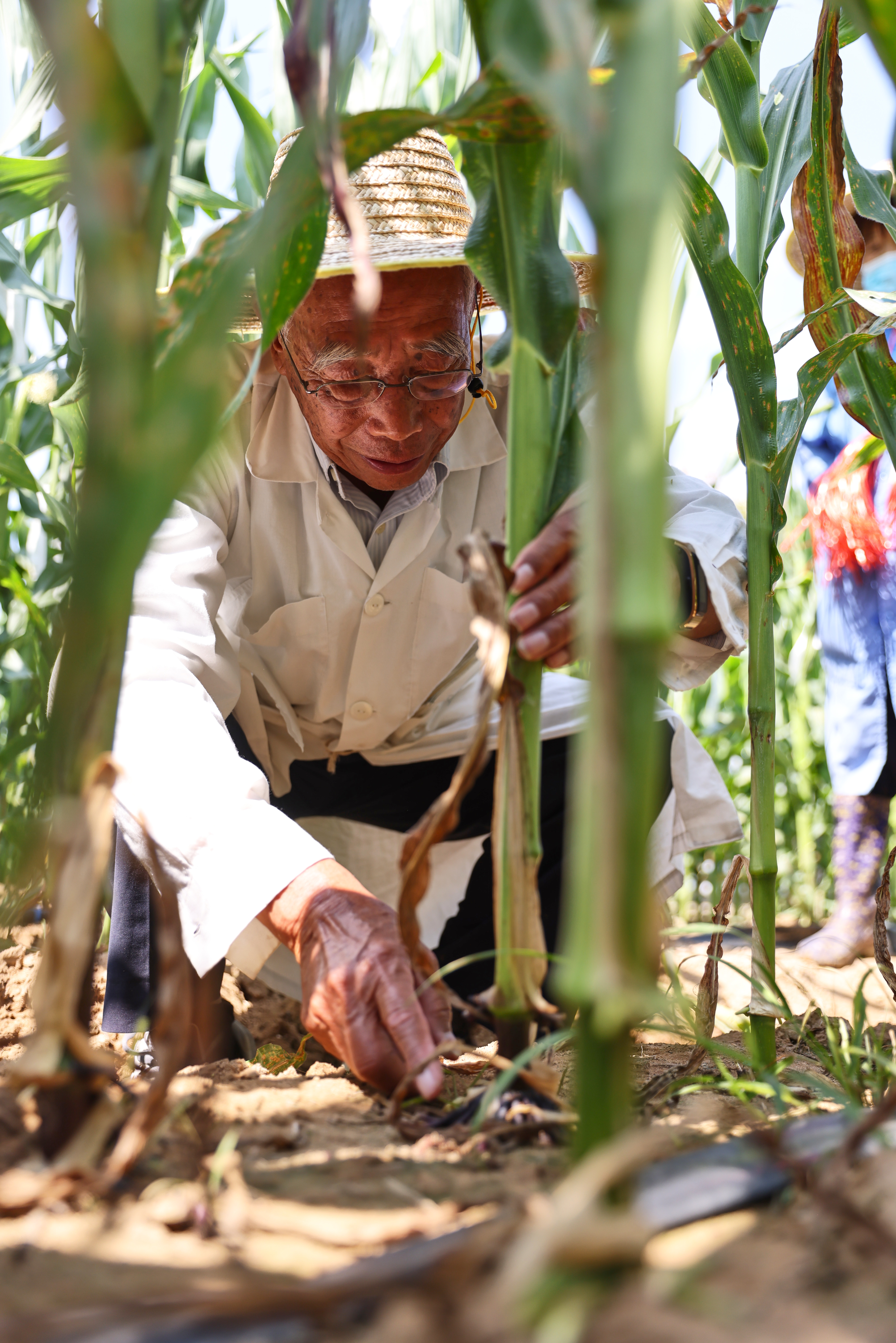 玉米育种专家程相文在三亚南繁育种基地观察玉米生长情况(2月24日摄)。新华社记者 张丽芸 摄