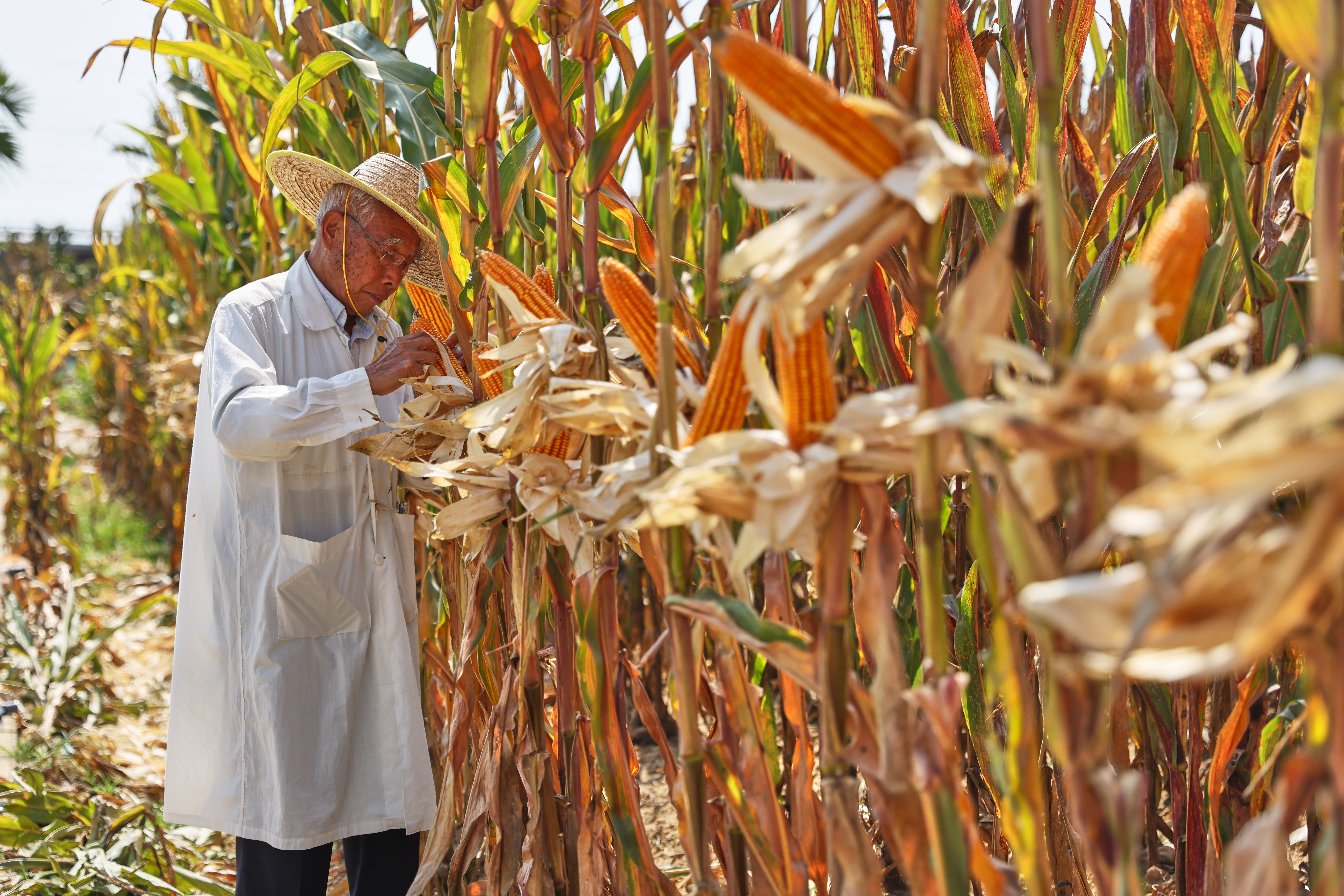 玉米育种专家程相文在海南省三亚南繁育种基地观察玉米生长情况(2月24日摄)。新华社记者 张丽芸 黄臻 编制