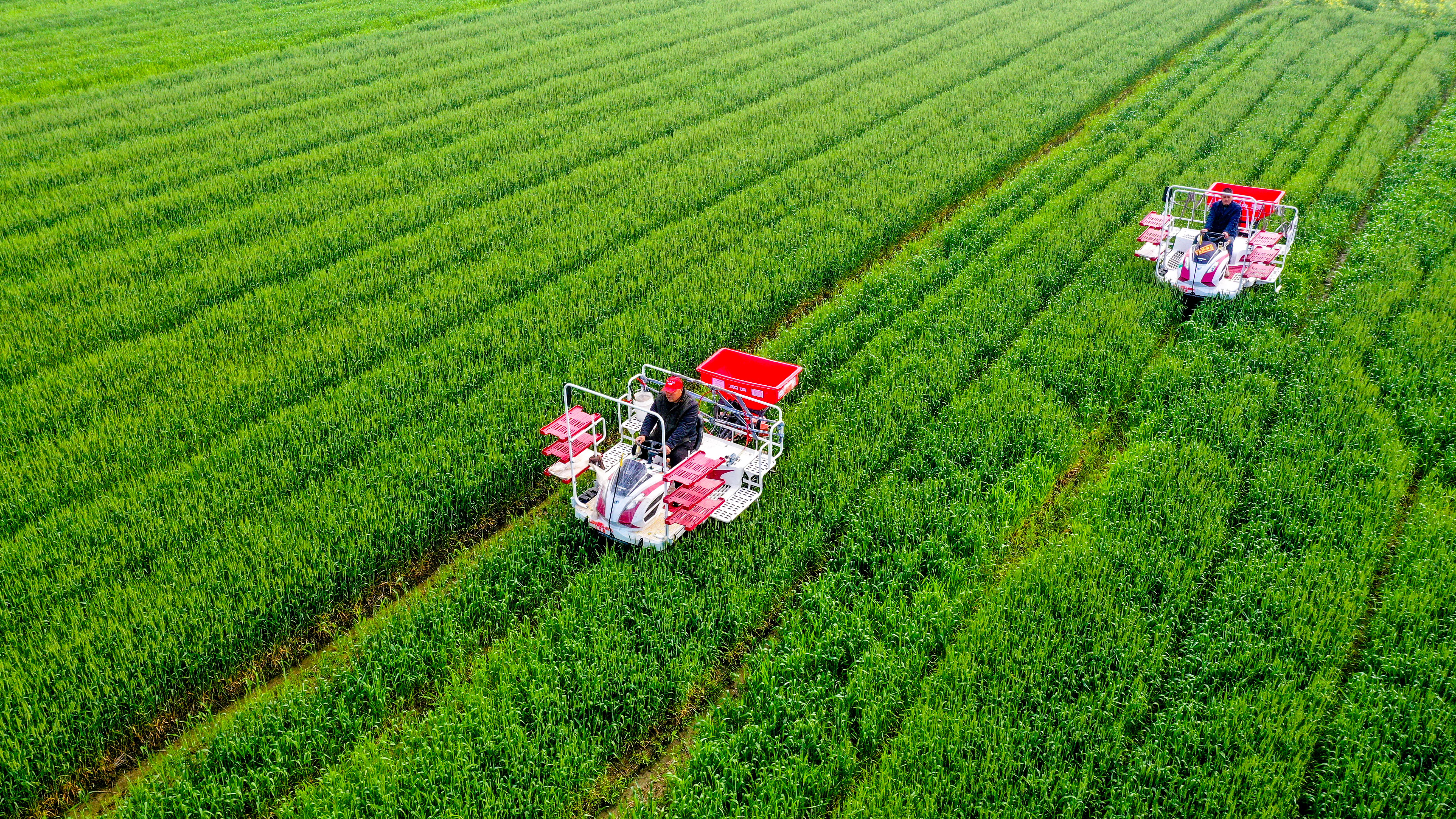 在浙江省湖州市长兴县和平镇回车岭村,种植户驾驶农机在田间劳作(4月5日摄,无人机照片)。新华社发(吴拯 摄)