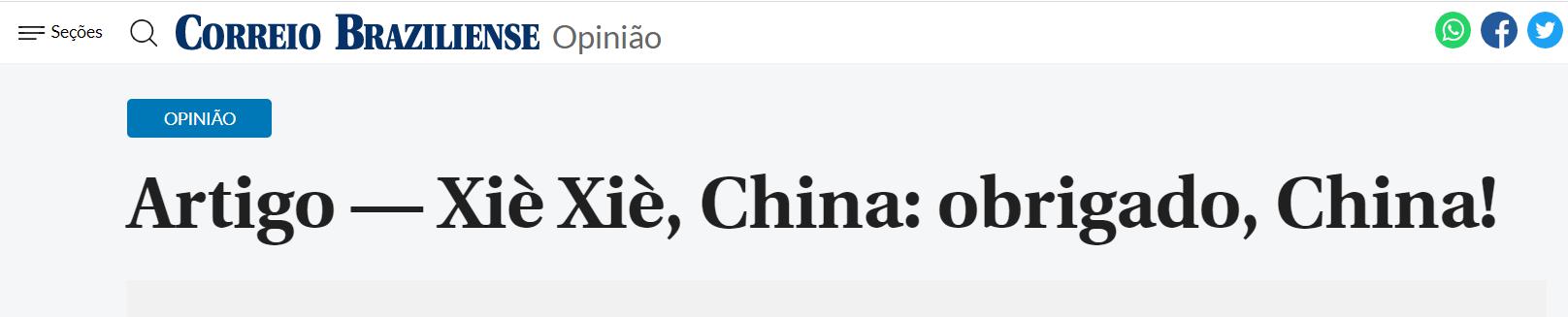 当地时间4月15日,巴西主流媒体《巴西利亚邮报》上发表了圣保罗州旅游厅厅长维尼修斯·卢莫茨的署名文章,题为《谢谢中国》,其中“谢谢”一词还使用了中文拼音书写。文中表示,由于位于圣保罗州的巴西布坦坦研究所与中国科兴合作,使得圣保罗州得以向巴西提供目前大约80%的疫苗。卢莫茨还在文中写道:“巴西和土耳其、印度尼西亚一道,成为这种合作模式的受益者,如果仅仅依靠欧洲和美国的帮助,我们这些国家可能会束手无策。”